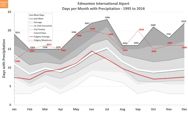 I actually have no idea what to expect from this. I tend to think of Calgary as being drier than Edmonton during the summer, but I don't know if that is true or not. And we have seen that during the winter Calgary will have more days with melting, but I don't know how the total amounts of snow compare.