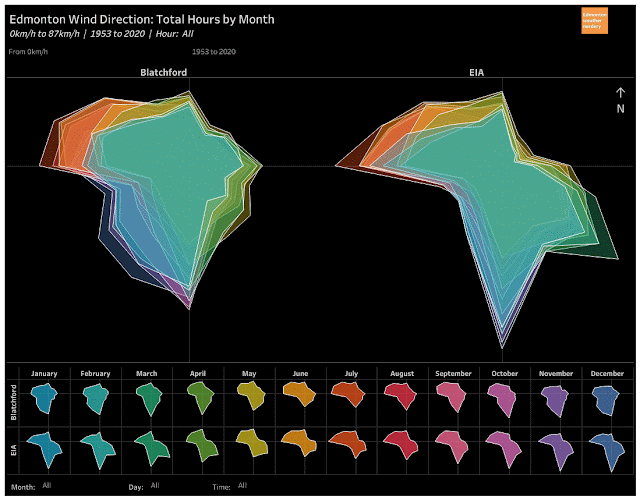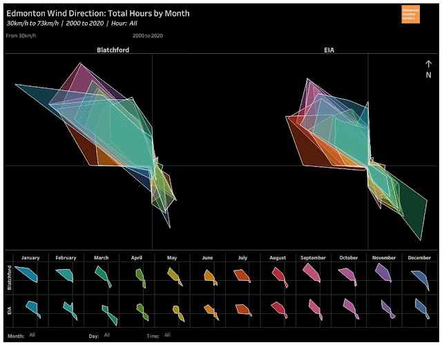 The previous charts included all years from 1953+, but here it is filtered down to only show 2000+, and windspeeds of 30km/h. We saw in Part 3 that windspeeds of 30km/h+ only happen about 5% of the time, and so these represent the fairly "windy" recent hours. Again we see mostly winds from the NW, although the SE is prominent through a lot of the year, and moreso at the International than at Blatchford.