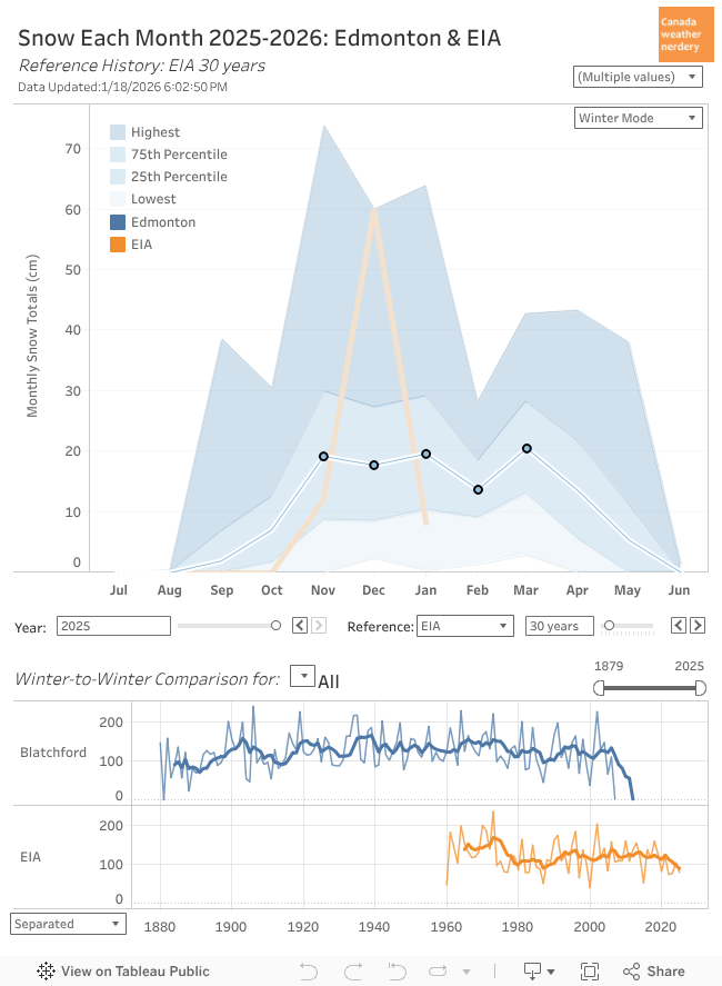 December 2025's 59.9cm was the biggest month since January 2011. Before that Blatchford had a snowy January 1999, and November 1996 was big for both.