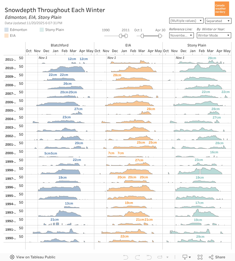 The outlying stations aren't a perfect proxy for the city, but they're not bad. Back when Blatchford did measure snowdepth it's numbers were maybe a little bit lower than the airport's, but it's still pretty close.