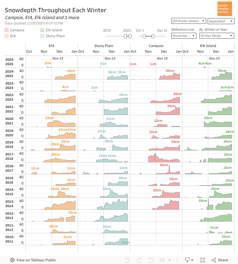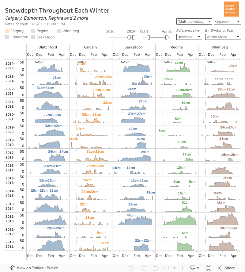 The Prairies For comparison, Calgary is very different from us, with their frequent chinooks keeping the snowdepth low or zero for most of the winter.