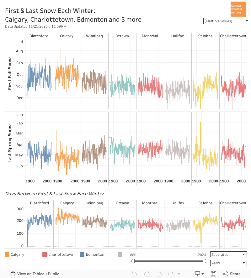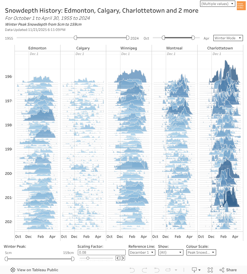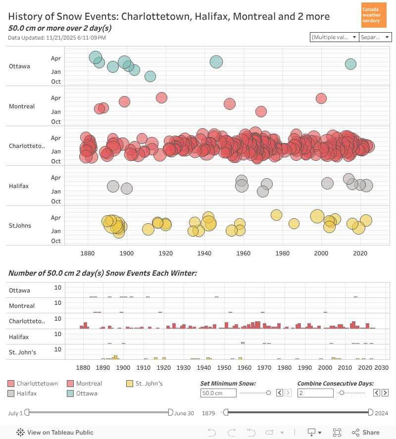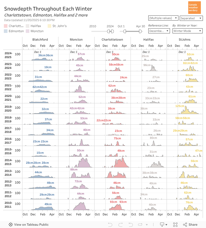 This is just a fun chart showing the full recorded history of snowdepths for a few stations. The darkest years are the ones with the highest peaks, and Charlottetown has a lot of them.