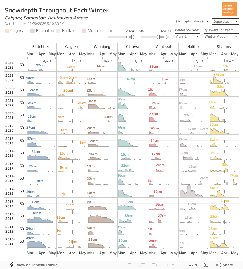 The big spring melt starts a week into March, and we (or at least the airport) are down to 0cm sometime in April.