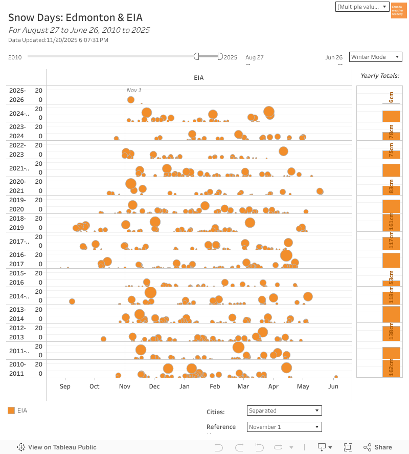 So Edmonton gets less snow than other cities, but we get it over a longer period of time.