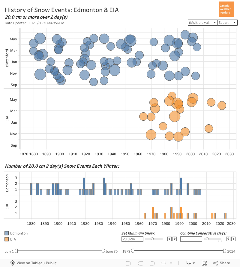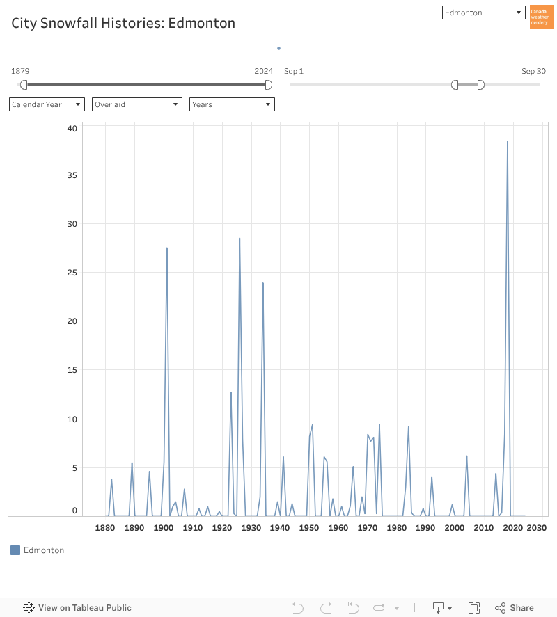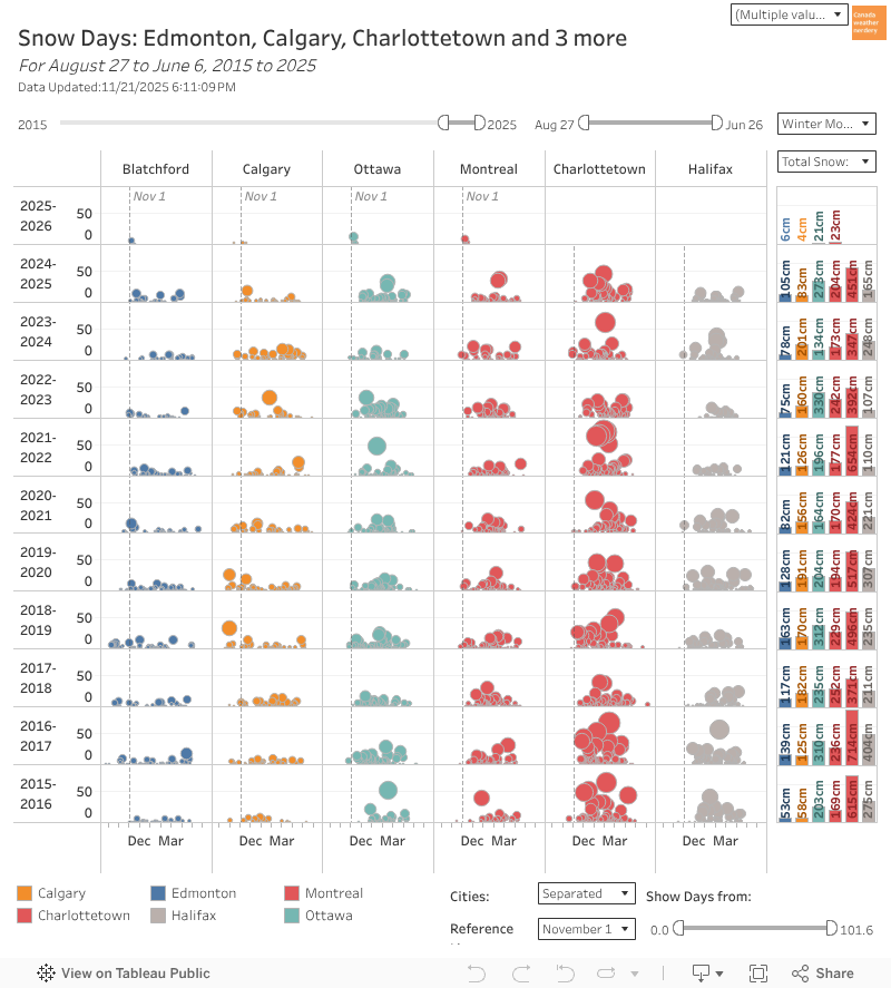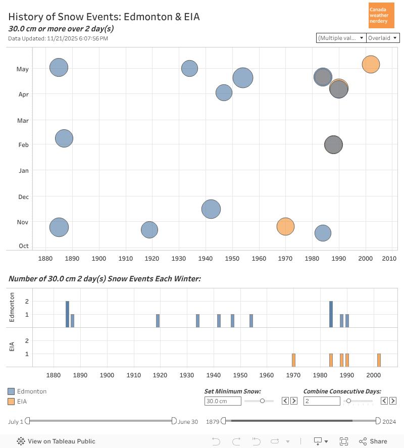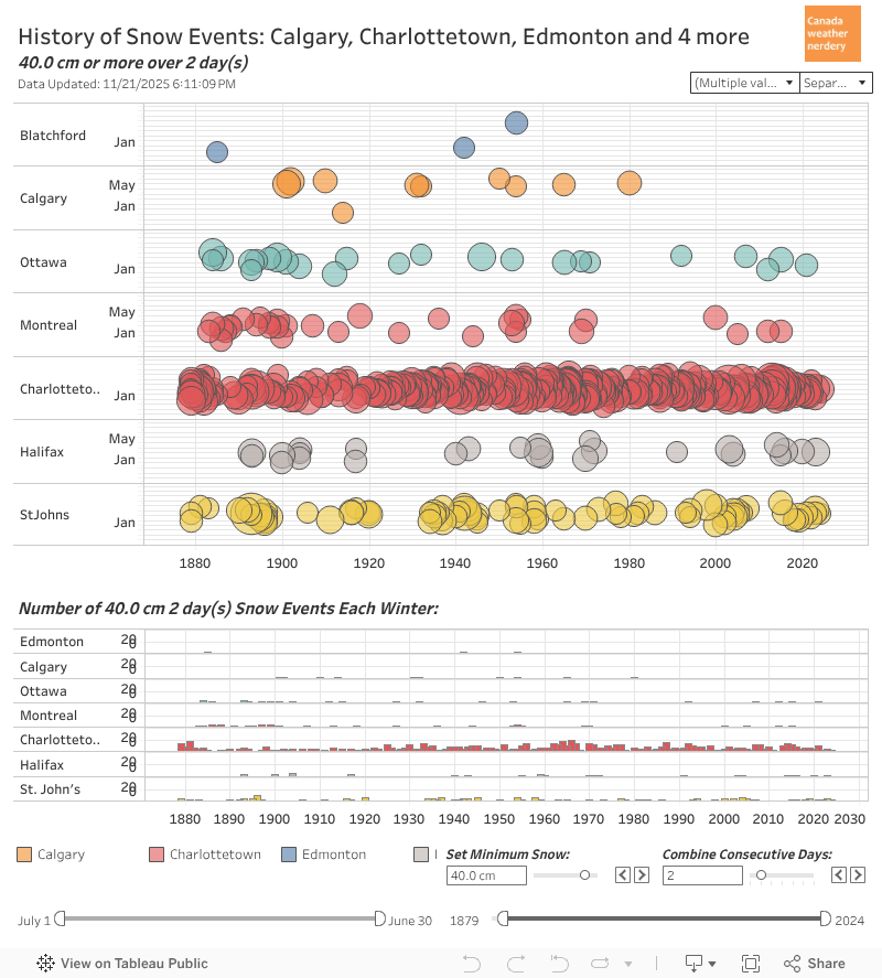 Big Storms Across Canada In 140+ years Edmonton has only had a handful of 40cm+ storms. Calgary has had a few more than that. Ottawa & Montréal got a lot before 1900, but now they're pretty rare. But Halifax still gets 1 in most winters, and Charlottetown gets a few every winter.