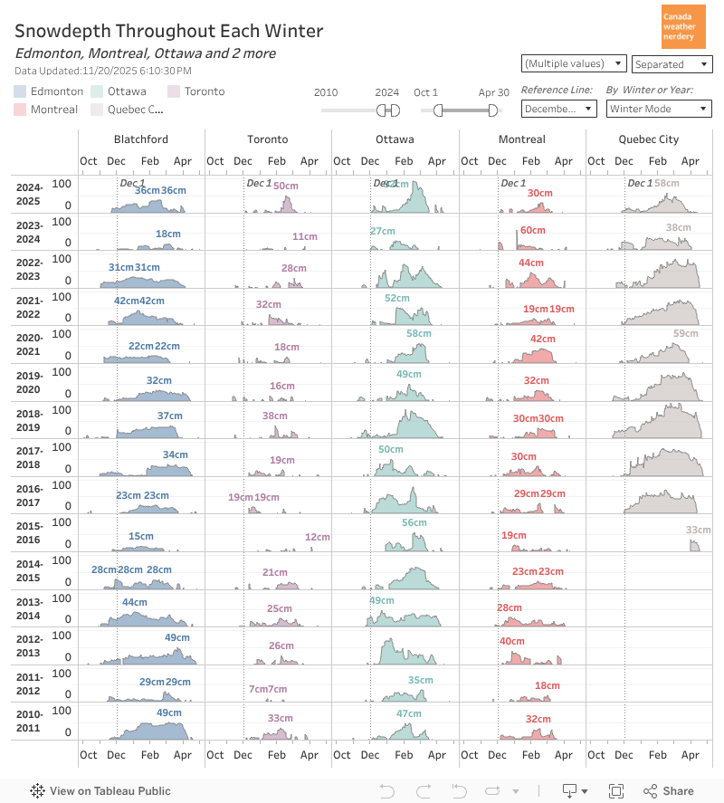 Central Canada Snowdepth in central Canada usually starts closer to the beginning of December. But where Edmonton usually peaks around 35cm, Ottawa & Quebec City will often get to 50cm, and sometimes up to 80cm or 90cm.