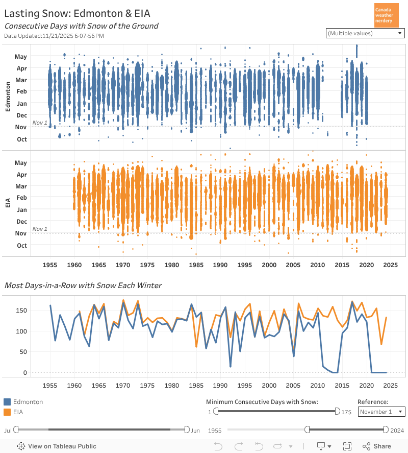 So we will usually have snow on the ground from mid-November to late-March, +/- two weeks on either end. On average that's around 130 days in-a-row. And that hasn't changed much since the 60s, and it wasn't too different between the city and the airport.